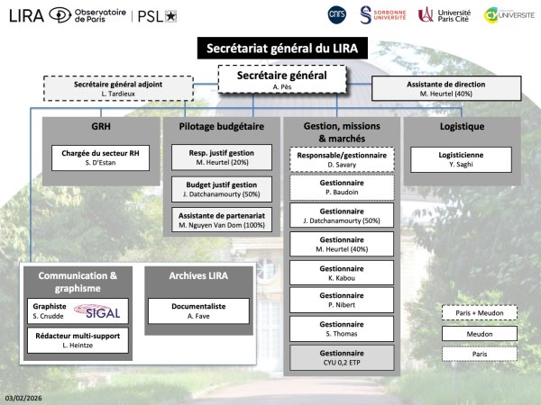 Le secrétariat général du LIRA regroupe les fonctions support du LIRA dédiées à l’administration générale du laboratoire.