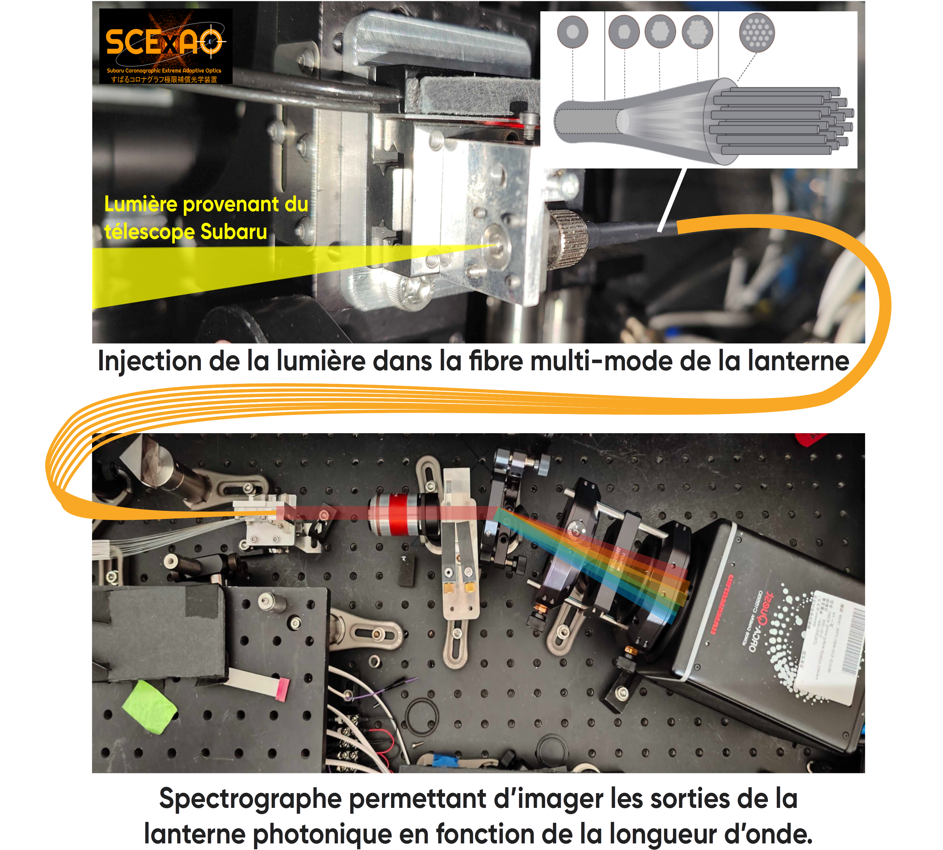 Chemin de la lumière provenant du télescope Subaru, traversant la lanterne photonique pour arriver dans le spectrographe.