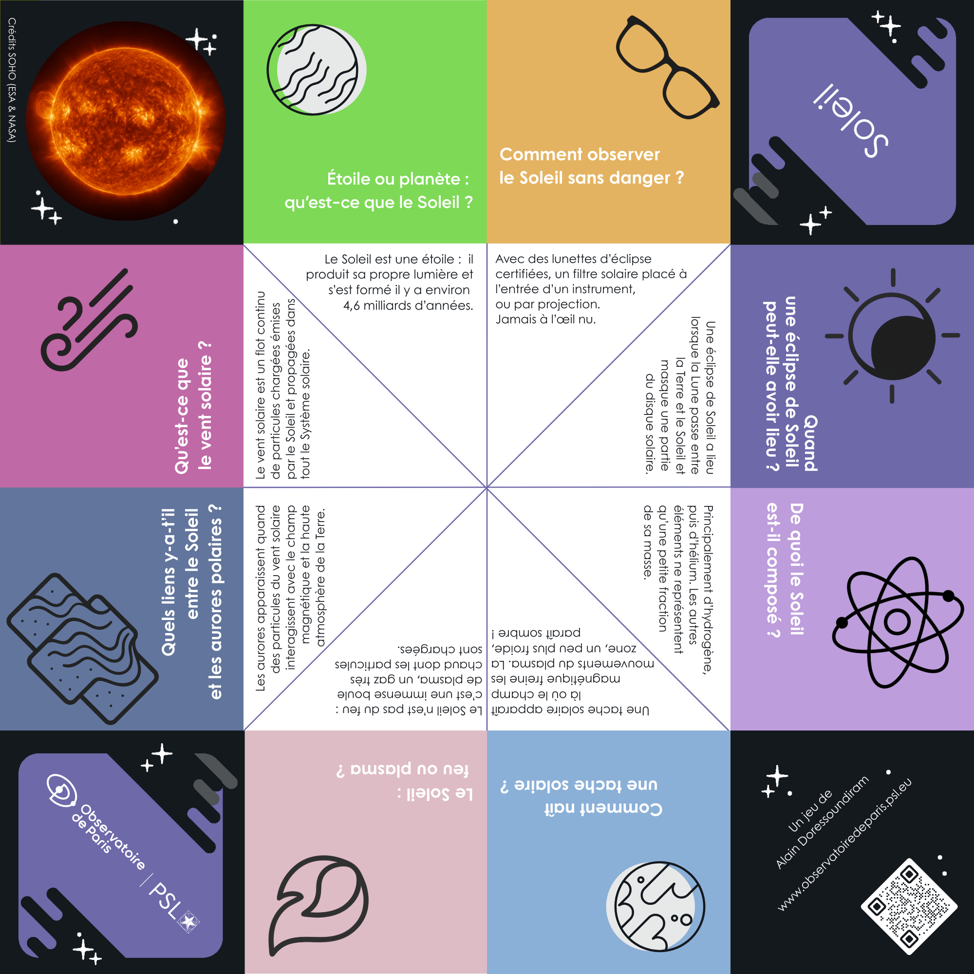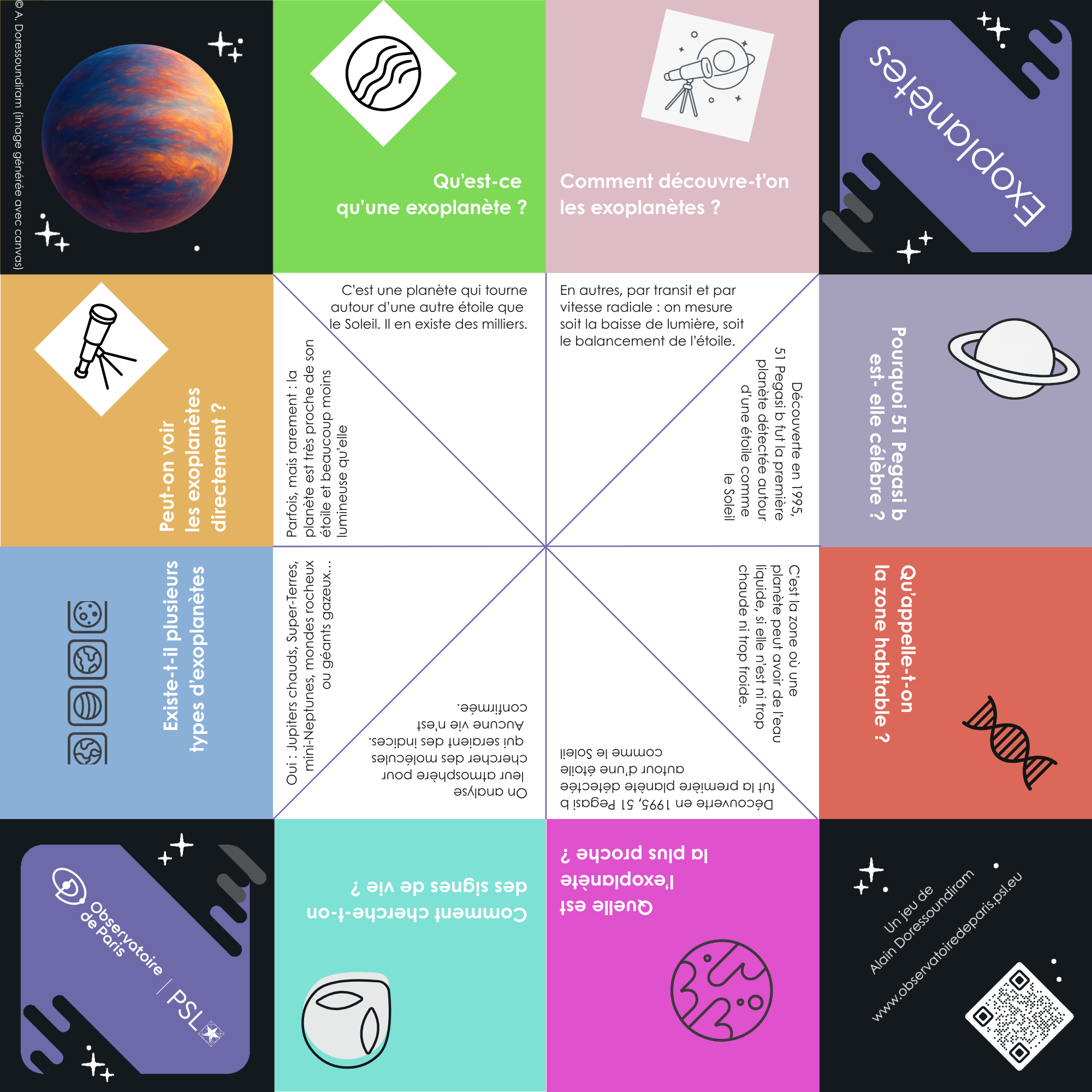 | Astroflash | Astroflash est un jeu d’ambiance composé de 31 cartes. Le but est d’être le plus rapide à repérer et à nommer à voix haute l’unique symbole identique présent entre deux cartes, qu’importe leur taille. Le jeu permet d’explorer et de s’approprier des objects célestes (planètes, nébuleuse,...) et des technologies spatiales (sonde, télescope,..) |
